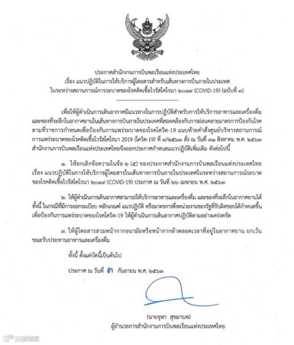 9月3日,泰国民航局发布了由局长朱拉签署的“疫情期间泰国国内航线旅客服务指南”的公布,相关公告如下:
