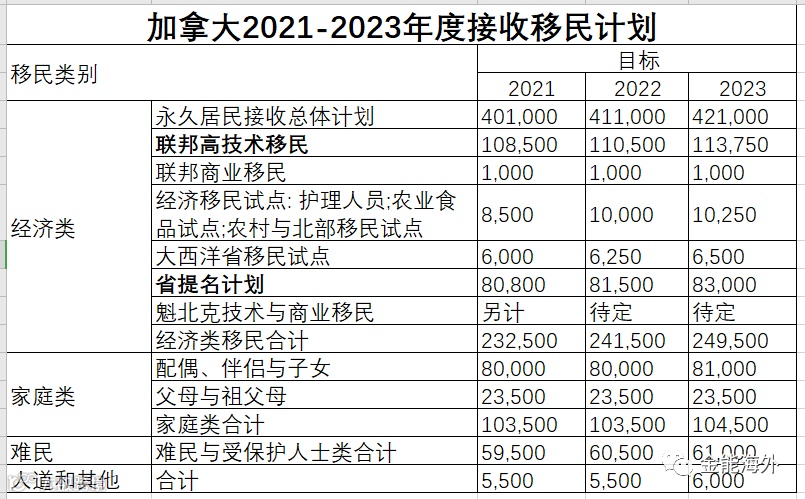 经济类移民中,数量最大的是联邦技术移民和省提名,在2021年计划中分别达到108,500人和80,800人。其次是几个新的试点项目,合计8,500人。大西洋省试点项目6,000人。