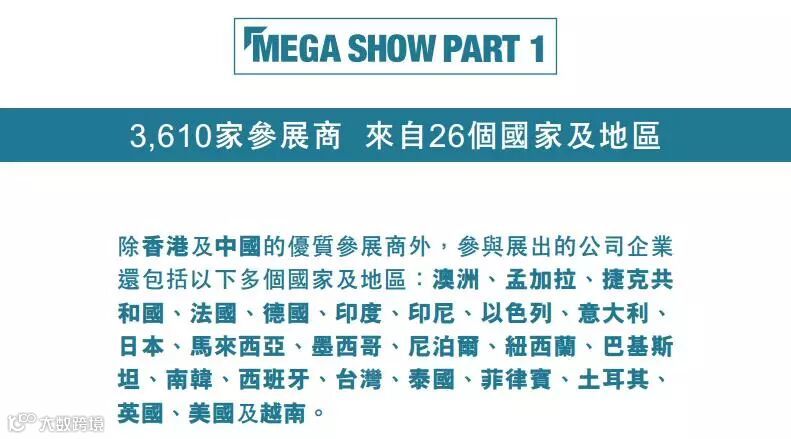 接下来,我们就分别为大家介绍:香港MEGA SHOW PART 1和香港MEGA SHOW PART 2 两次展会。