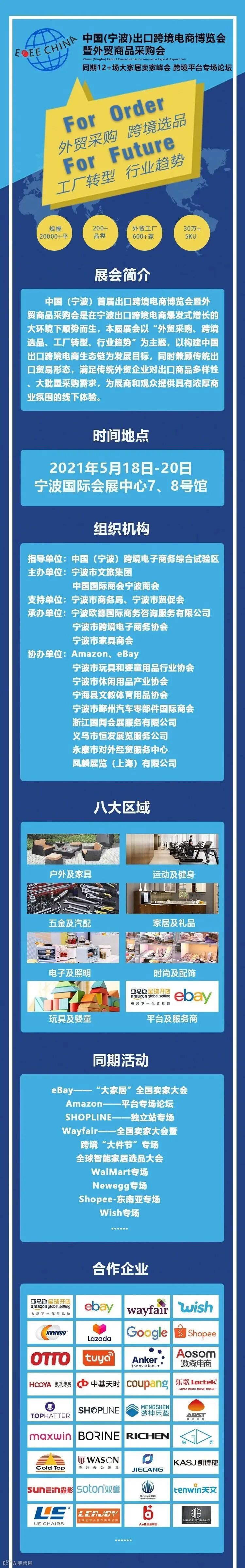 2021年中国(宁波)出口跨境电商博览会暨外贸商品采购会即将于5月18日-20日在宁波国际会展中心举办,展会规模超20000㎡,全国600多家外贸工厂参展,展品种类达200多种,展会期间将举办一系列卖家峰会及跨境平台专场论坛。敬请期待!