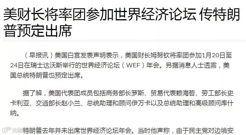 美财长将率团参加世界经济论坛 传特朗普预定出席