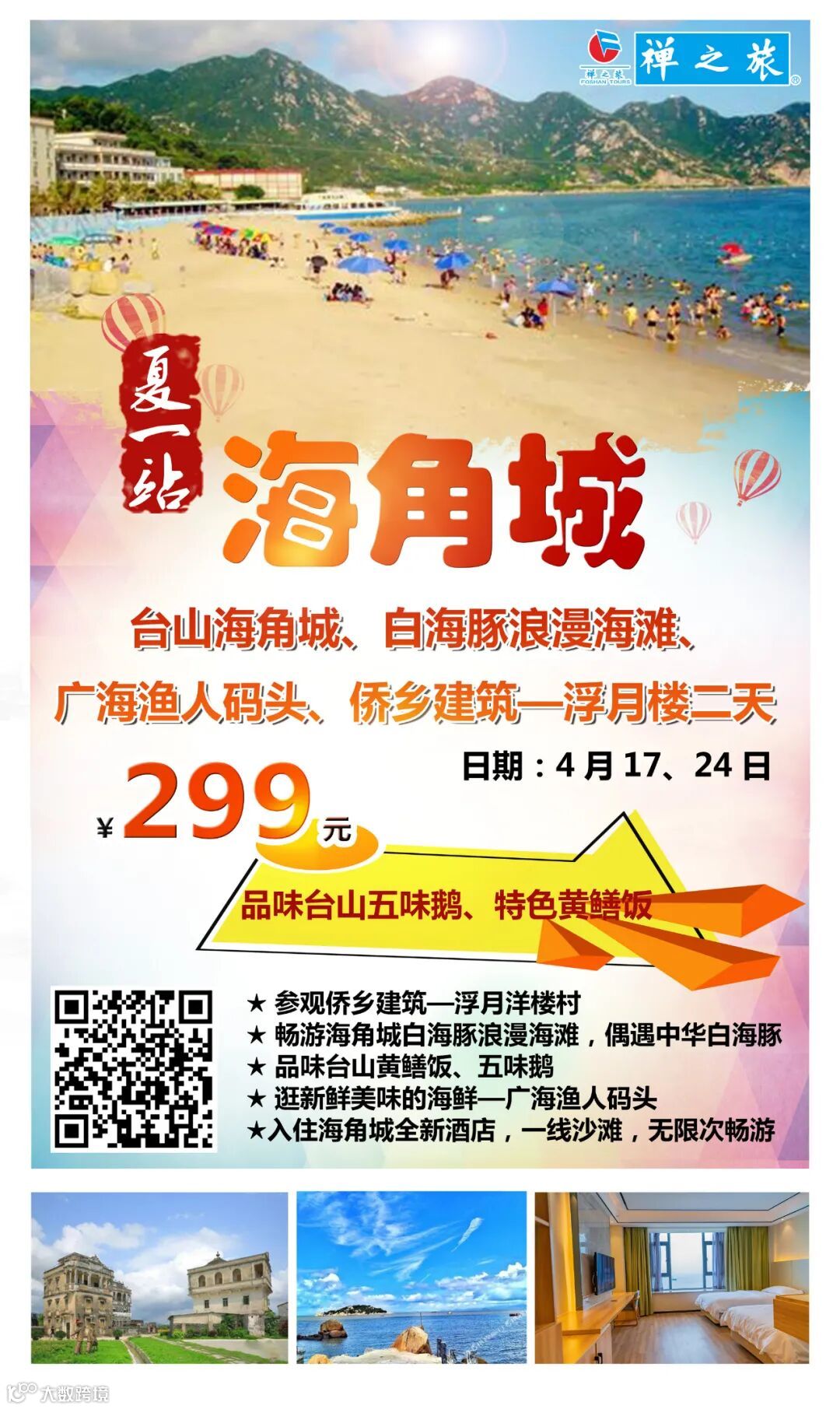 ★ 参观侨乡建筑—浮月洋楼村 ★ 畅游海角城白海豚浪漫海滩,偶遇中华白海豚 ★ 品味台山黄鳝饭、五味鹅 ★ 逛新鲜美味的海鲜—广海渔人码头 ★入住海角城全新酒店,一线沙滩,无限次畅游 |