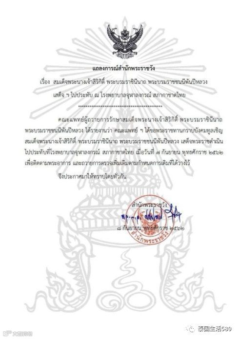9月8日,泰国王室宫务处发布消息,称泰国诗丽吉王太后驾临泰国朱拉隆功医院。御医团队透露,9月7日,御医恭请诗丽吉王太后驾临泰国朱拉隆功医院复查并依例进行额外体检。