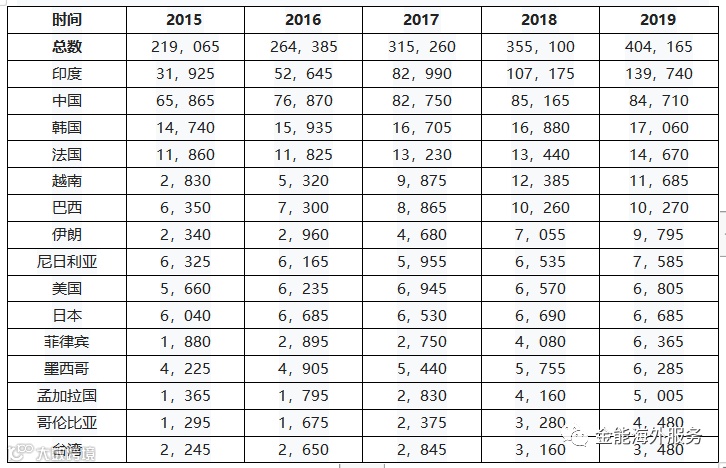 2019年加拿大迎来全球超过40万国际留学生,较2015年以来的留学生数量几乎翻了一番,大多数学生来自印度,中国,韩国,法国,越南,巴西,伊朗,尼日利亚,美国和日本。