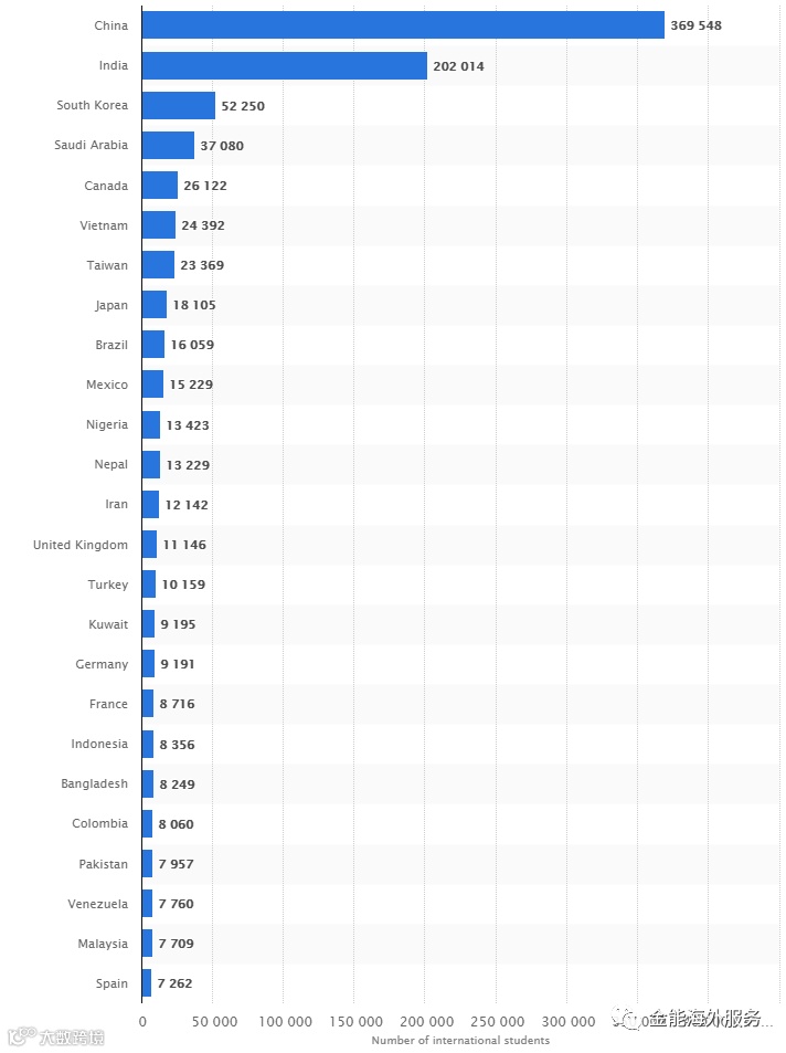 根据美国国际教育协会发布的《美国门户开放报告》,2018-2019 学年,中国在美留学生总数为 37 万人,占美国国际学生总数的 33.7%,中国连续第 10 年成为美国最大的留学生来源国。不过,2018-2019 学年中国留学生人数的增长率跌至 1.7%,为 10 年来最低。