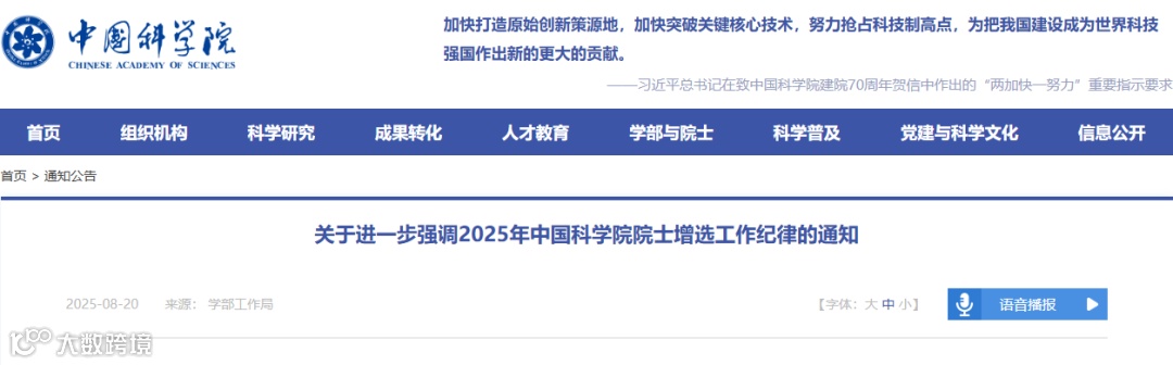 8月20日,2025年院士增选有效候选人名单公布,中国科学院发布了“关于进一步强调 2025年中国科学院院士增选工作纪律的通知”。通知要求,中科院院士有效候选人须严格遵守有关规定,严格遵守“静默期”要求,在增选过程中严格自律,遵规守纪。如违反增选工作纪律要求,将依规严肃查处,情节严重的,永久取消参选资格并终身追责;如已当选,则按程序取消院士称号。