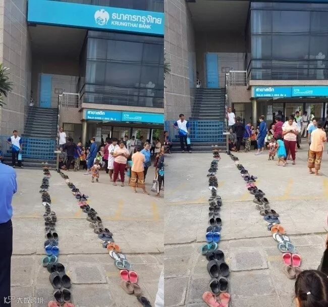 最近网上疯传一张照片透露,大量民众聚集在武里喃府沙兑县泰京银行分行前,用鞋子代替人整齐有序地排了两列长队,等待『扫脸』确认身分,领取政府『吃玩购』1000铢旅游补贴,人则在不远处随意休息,网友盛赞不已。