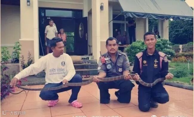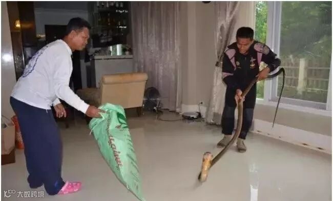 尖竹汶府玛堪县雨娲蒂女士(54岁)正在家中沙发上躺着休息时,突然看到一条大眼镜王蛇紧追着一条鼠蛇进了家,就在靠近她头部的窗帘旁,吓得她赶紧报警求助。救援队抓出的眼镜王蛇身长4米多,重约20公斤,幸好没有攻击女屋主。