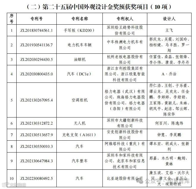 中国外观设计金奖、中国外观设计银奖及中国外观设计优秀奖从外观设计专利中评选产生,评出中国外观设计金奖不超过10项、中国外观设计银奖不超过15项。中国专利优秀奖、中国外观设计优秀奖的获奖比例均不超过各类合格项目数的30%。