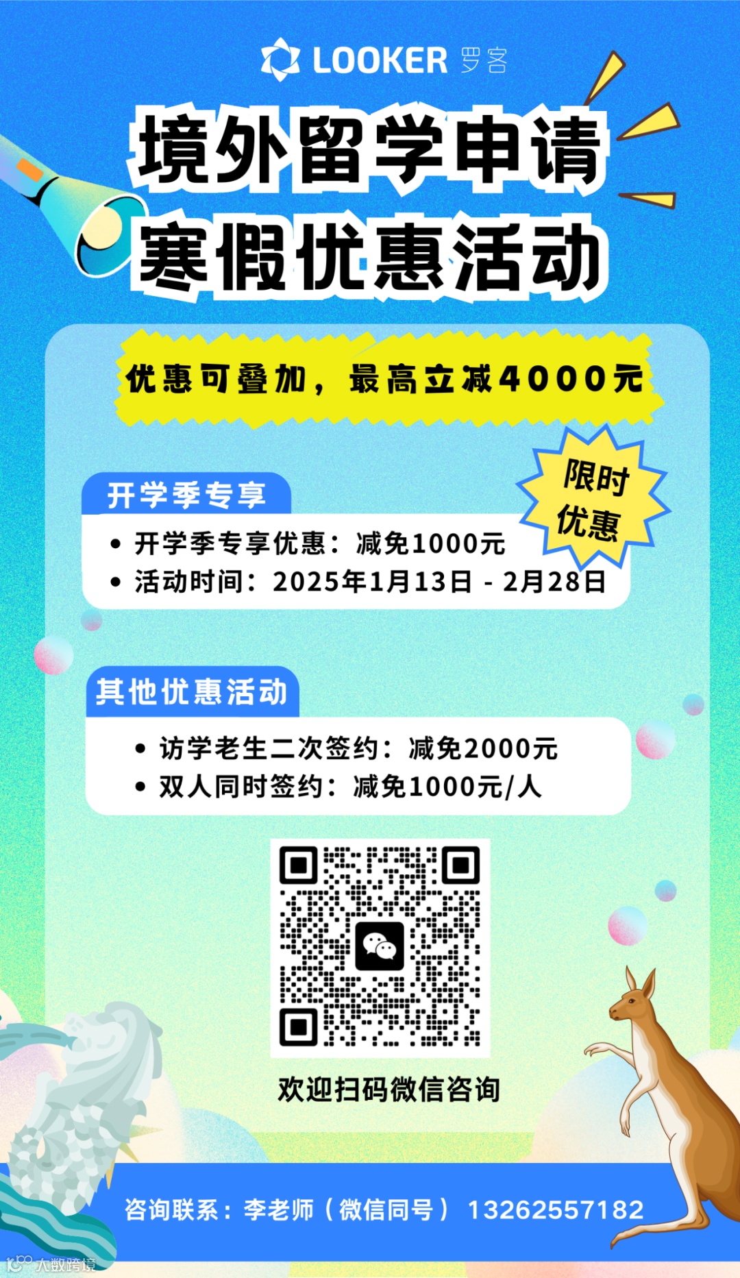 现在我们推出境外留学申请寒假优惠活动,最高立减4000元,详情见下图,可扫码加微信,与顾问老师沟通。