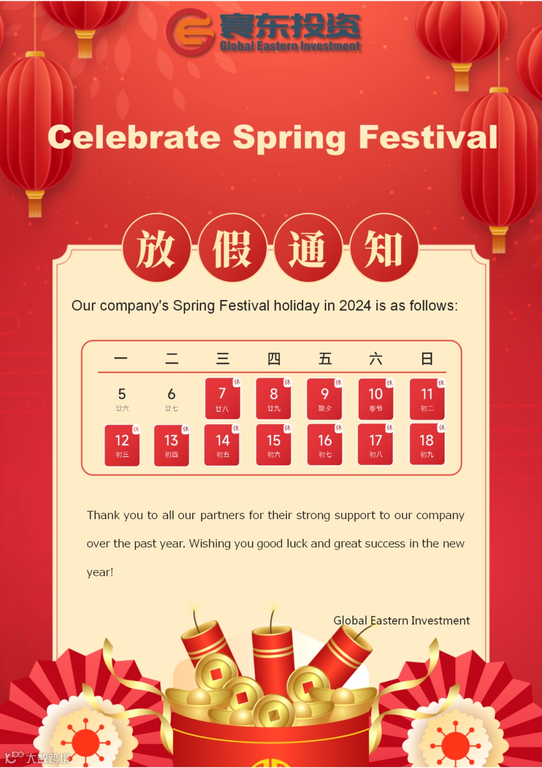 Dear customers and friends,The New Year is coming, everything is renewed!First of all, all my colleagues here deeply thank you for your long-term support and trust in our work, and extend the most sincere wishes and greetings. In the New Year of 2024, we will work harder to provide better and efficient services for our customers and friends.Here is a warm reminder to customers and friends:Our Spring Festival holidays are as followsFrom 07th February 2024 to 18th February 2024,The holiday lasts 12 days.Our office will be officially started on 19th February 2024 (Monday) .During the holiday, if the message is a little slow to reply, please forgive me.. As the Spring Festival is approaching, I wish you good health, smooth work and all the best in the New Year.