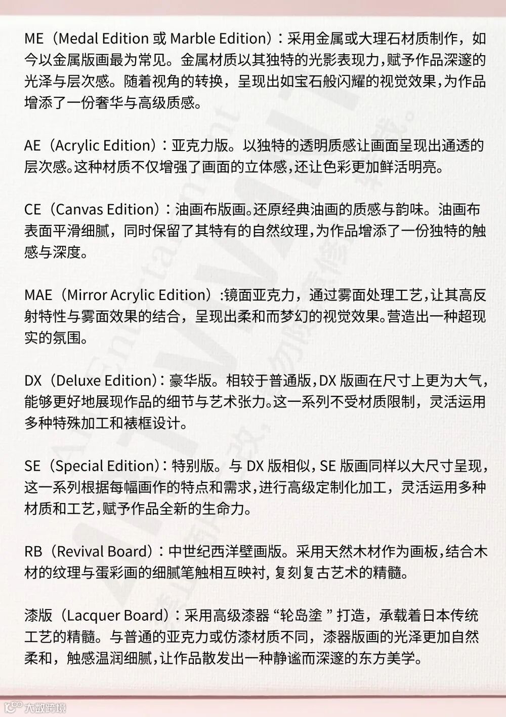 温馨提示:DX版与SE版虽然名称不同,但它们的核心特点非常相似:比普通版画更加大气、精致。无论是更大的尺寸、更丰富的细节,还是精心设计的裱框与独特的工艺效果,DX与SE版画都旨在为观者带来强烈的视觉冲击与享受。
