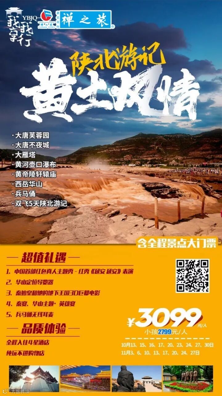 ¥3099元┃【陕北游记】10-11月出发:西安大唐芙蓉园、大唐不夜城、大雁塔、壶口瀑布、黄帝陵轩辕庙、西岳华山、兵马俑双飞五天 禅之旅容桂营业部