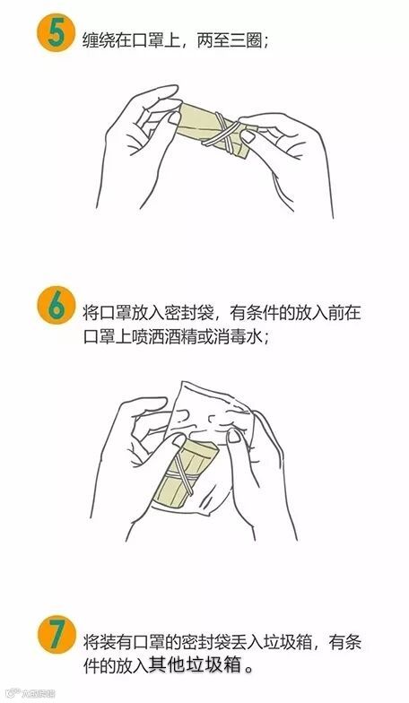 丢弃口罩时,一定一定不要让污染面朝外,摘除口罩后一定一定要认真洗手,丢弃口罩要用垃圾袋包好再丢到收集点。