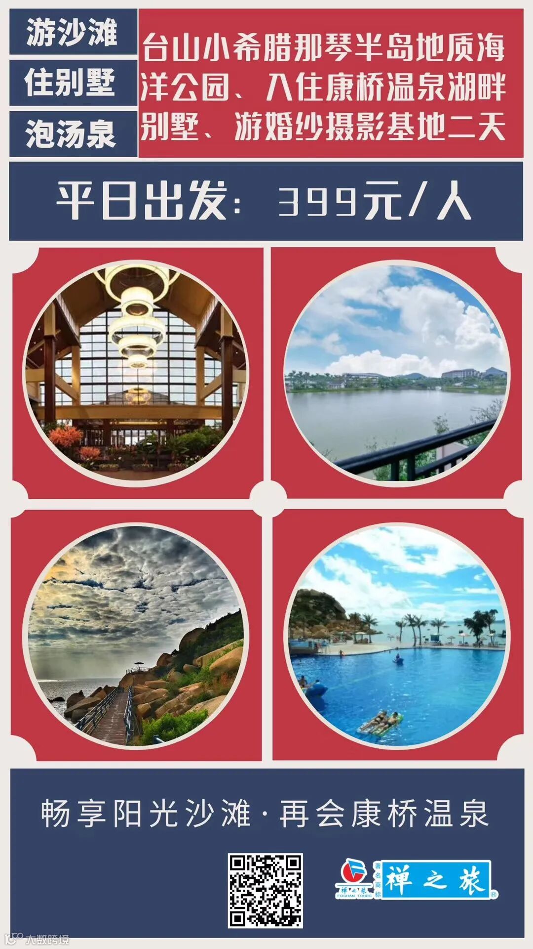 佛山--江门 早上指定时间出发前往台山【那琴半岛地质海洋公园】漫步于沿海栈道 —— 碧海蓝天、无敌海景,尽收眼底!除了有沙滩海浪、奇山秀石等自然景观,还有环山沿海栈桥、地中海风格建筑物等拍摄元素与上下川岛隔海相望,其海岸线全长6000多米,沿岸拥有包括浪琴湾、庙湾、柑果湾、白马湾和峡湾等五个海滩。那琴半岛景色迷人,不仅有沙质优良的天然海滩,还有风光旖旎的海湾,也有奇特山景石林,包括坐官山,企官山,水井山,牛头山和桌子山。这里有“不到坐官山,枉到那琴行”的传说,并且,这里可以让人们感受地球生态的魅力及体验亲子自然的时光。那琴半岛地质海洋公园被誉为当今世界上地质海洋旅游观赏的最佳景点之一。 前往【康桥温泉度假村】办理入住(含无限次温泉)坐落在风光绮丽、环境优美的台山市白沙镇朗南铜锣地村,度假村北面为现存的自然村庄,东、南面为青翠的小山丘连绵环绕,一条蜿蜒曲折的小河从山谷流向美丽的村落,晶莹剔透的温泉水静静的躺在河下,时儿冒出水面轻轻的涌动,时儿化作缕缕轻烟在空中飞舞,烟雾缭绕,犹如仙境。这里成了人们梦寐以求的旅游度假胜地。 |