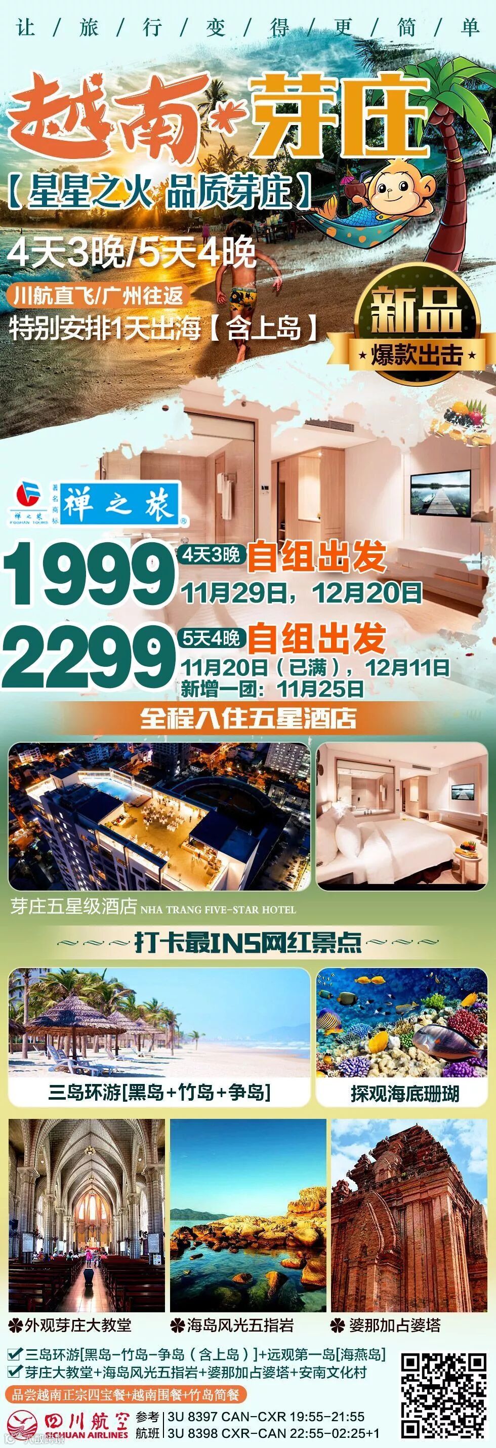 1.畅游有东方马尔代夫美称的越南芽庄,🇻🇳 2.川航广州直飞,全程入住五星酒店, 3.打卡经典景点:法国哥特式建筑芽庄大教堂,海岛风光五指岩⛰ —影帝梁家辉主演的法国电影《情人》的外景地, 号称越南小吴哥的“婆那加占婆塔”, 4. 芽庄最美海岛出海一天:三岛环游:黑岛--竹岛- 争岛 (含上岛), 5. 越南民俗村的安南四宝餐�,� 🌮 6.游览洋人街区体验“西贡夜生活”。 |