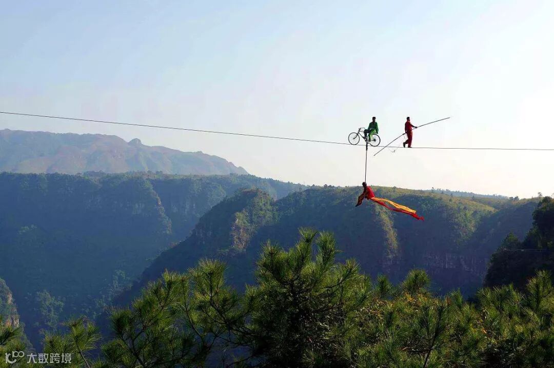 站在峡谷的旁边可以看到惊险刺激的空中钢丝表演