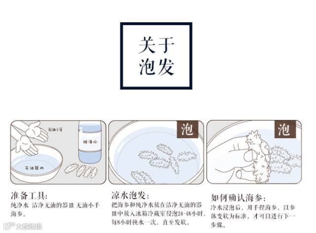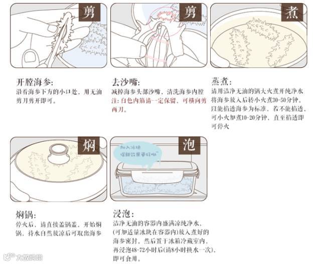 无油的容器干净的小手,把海参放到容器里,加入纯净水,放入冰箱内储存,每8-10小时换水两次。