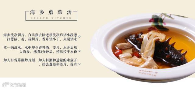 海参是典型的高蛋白质低脂肪食物,几乎不含胆固醇。就此而言,其营养价值是高过猪、牛、羊肉与鸡、鸭肉的。海参含胶原蛋白多,有人称其可与中药阿胶媲美,对妇女有生血养血、有润肤美容的功效。海参的精氨酸含量较高,有“补肾、益精”的功效。 但是,怎样发制海参才能让其所含的各种营养物质释放出来以致让我们人体吸收呢?!