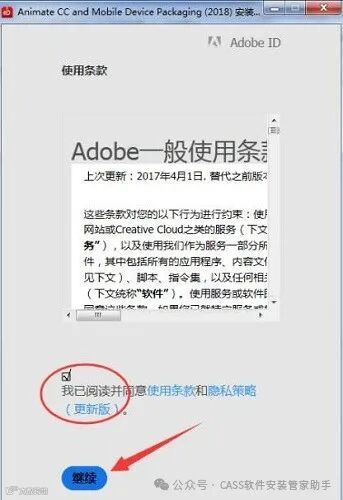 5.登录后,把“我已阅读.....”打勾,点击“继续”。