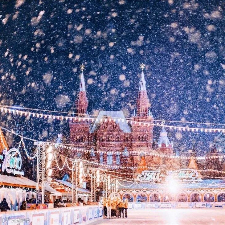 冬天的红场变成了巨大的室外滑冰场,使得原本庄严肃穆的气氛平添了不少活力。即使在一片苍茫白雪中,许多孩子依然活力十足,三五成群地追逐嬉戏,五彩绚丽的灯饰映照在他们的笑脸上,一切都那么“温暖”。