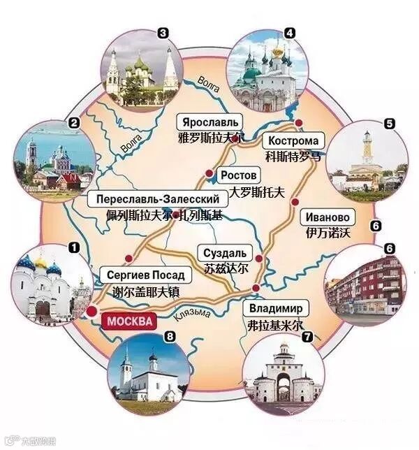 在莫斯科东北,有一圈由中世纪城镇组成的“金环”(主要城市有:谢尔吉耶夫镇、佩列斯拉夫尔•扎列斯基、罗斯托夫、雅罗斯拉夫尔、科斯特罗马、伊万诺沃、苏兹达尔和弗拉基米尔)。