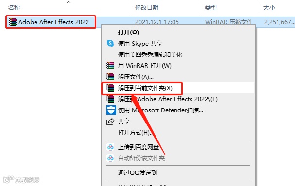 1.下载并解压【AE2022】软件安装包,鼠标右击压缩包选择【解压到当前文件夹】。