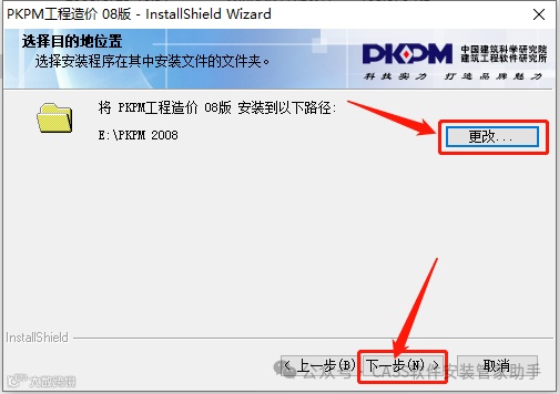 7.点击【更改】设置PKPM2008软件的安装路径,建议安装在除C盘以外的磁盘,用户可自行设置,设置好安装路径后点击【下一步】。