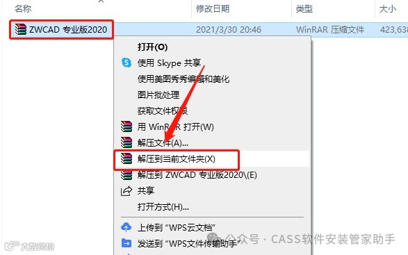 1.下载中望CAD2020软件安装包,鼠标右击压缩包选择【解压到当前文件夹 】。