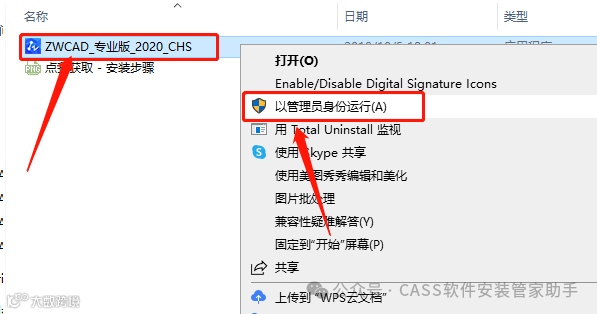 4.鼠标右击【ZWCAD_专业版_2020_CHS】安装程序,选择【以管理员身份运行】。