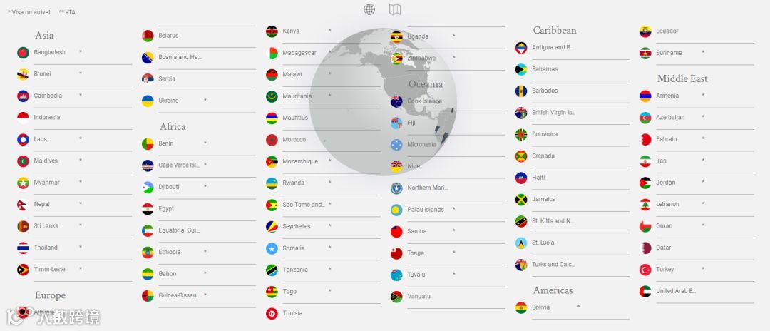 圣马力诺(需先入境意大利)、塞舌尔、毛里求斯、巴哈马、格林纳达、斐济、厄瓜多尔、汤加、塞尔维亚、巴巴多斯、阿联酋、波黑、白俄罗斯