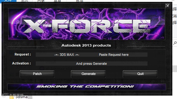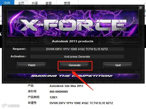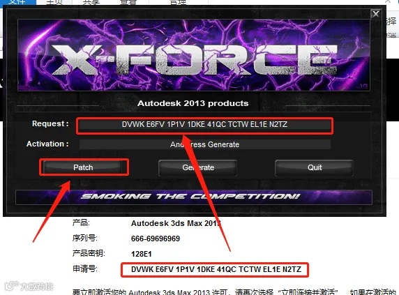 22.使用ctrl+C键复制申请号,然后使用ctrl+V键粘贴至注册机中的Request方框中,粘贴好后点击注册机左下角的【Patch】。
