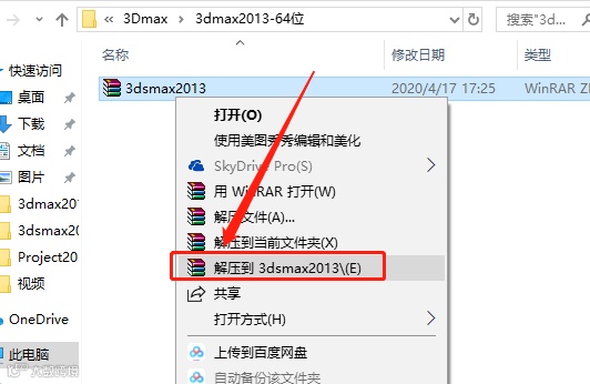1.下载【3dmaX 2013】安装包,鼠标右击压缩包选择【解压到3dsmax2013\(E)】。