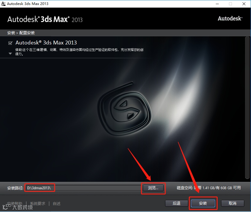 6.点击【浏览】设置3dmax2013的安装路径,设置好安装路径后点击【安装】。