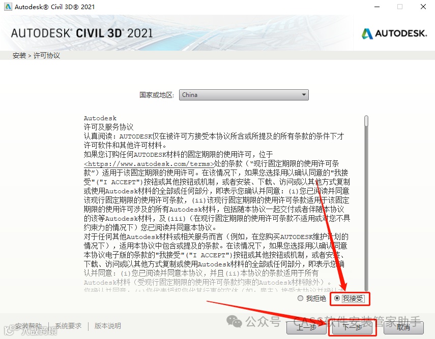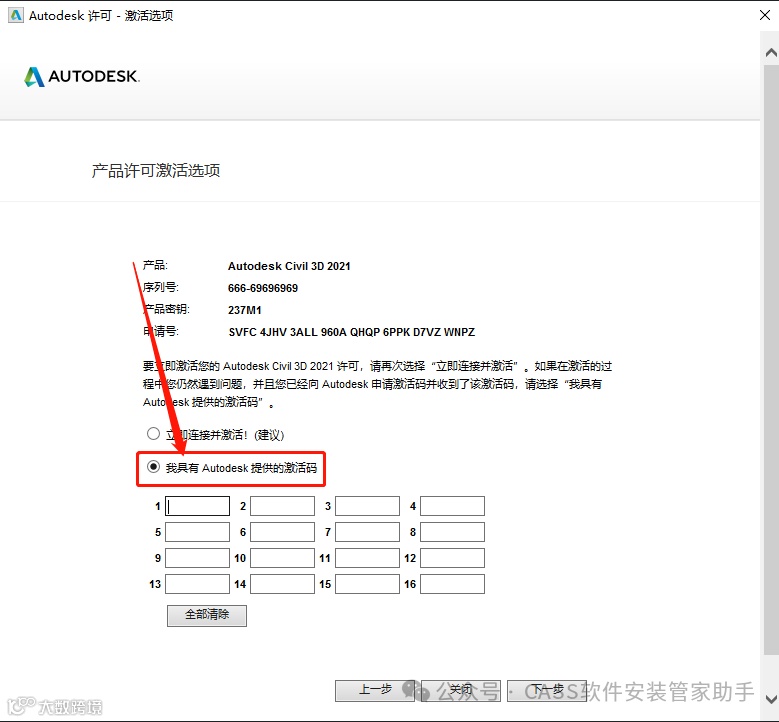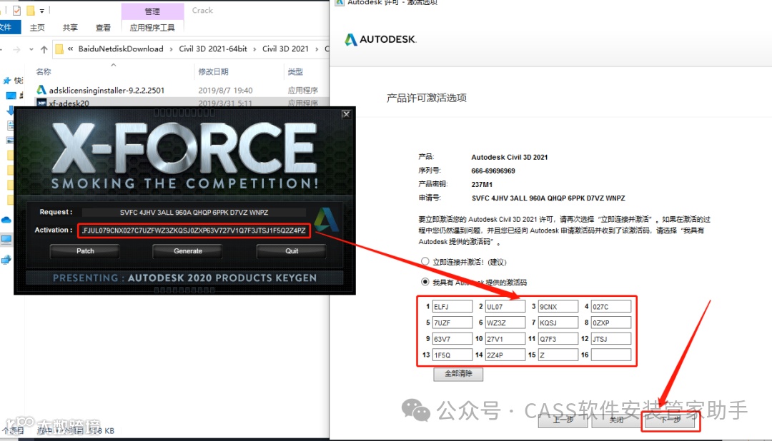 39.全部选中【Activeation】中生成的激活码,使用Ctrl+C快捷键或者鼠标右击复制生成的激活码,然后粘贴激活码至【我具有Autodesk提供的激活码】方框中,最后点击【下一步】。