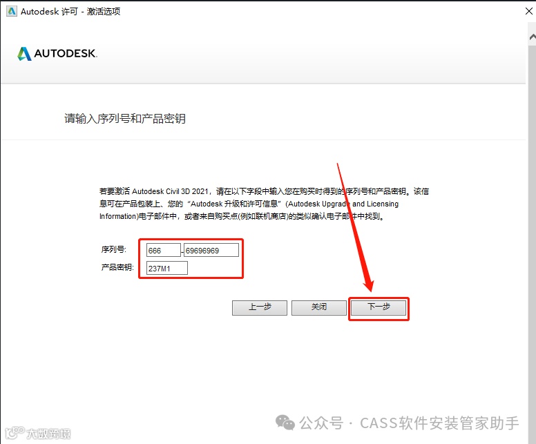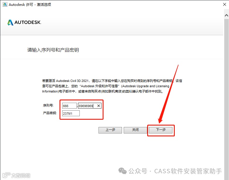 32.输入序列号:666-69696969,产品密钥:237M1,点击【下一步】。
