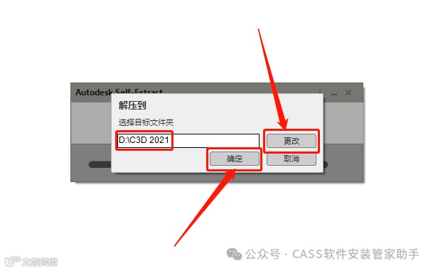 5.点击【更改】设置安装程序的解压路径,建议解压到除C盘以外的磁盘,设置好安装路径后点击【确定】。