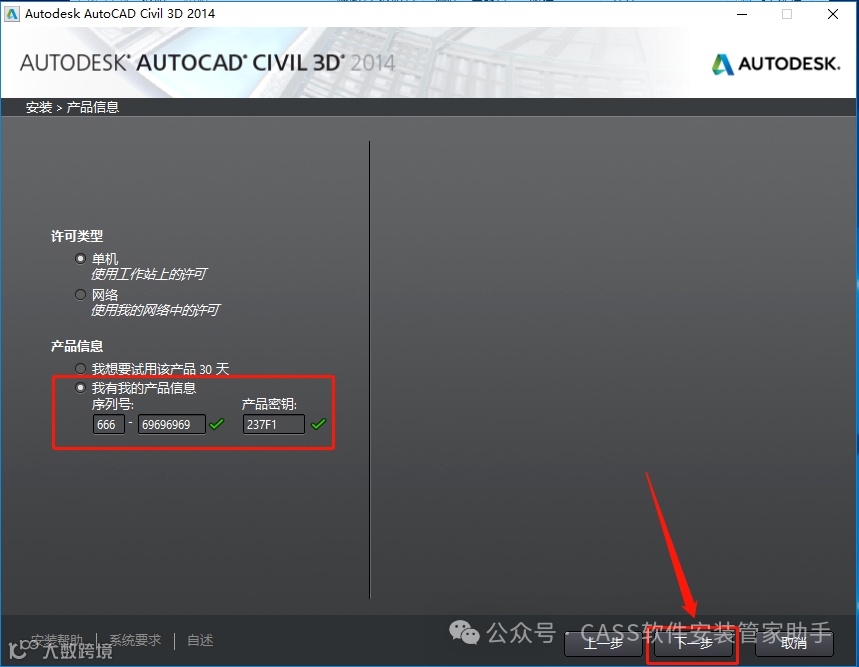 8.输入序列号:666-69696969,产品密钥:237F1,输入好后点击【下一步】。