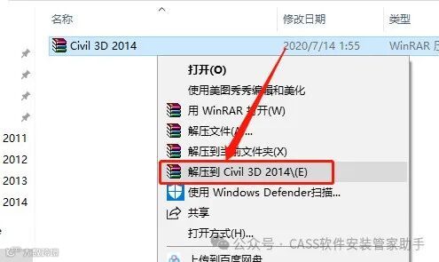 1.下载并选中【Civil 3D 2014】软件压缩包,鼠标右击选择【解压到Civil 3D 2014】。
