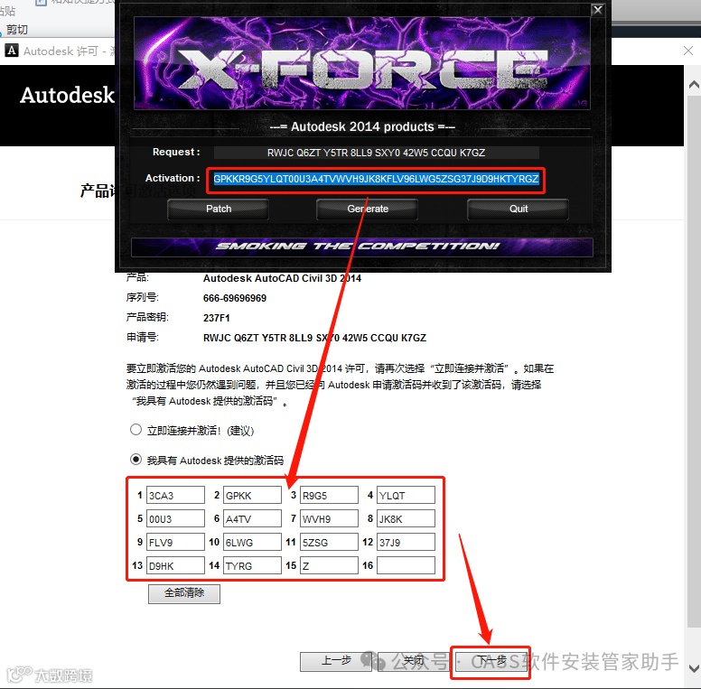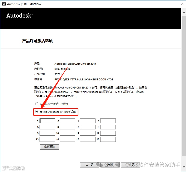 28.全部选中Activation中生成的激活码,使用Ctrl+C键或者鼠标右击复制生成的激活码,然后粘贴激活码至我具有Autodesk提供的激活码方框中,点击【下一步】。