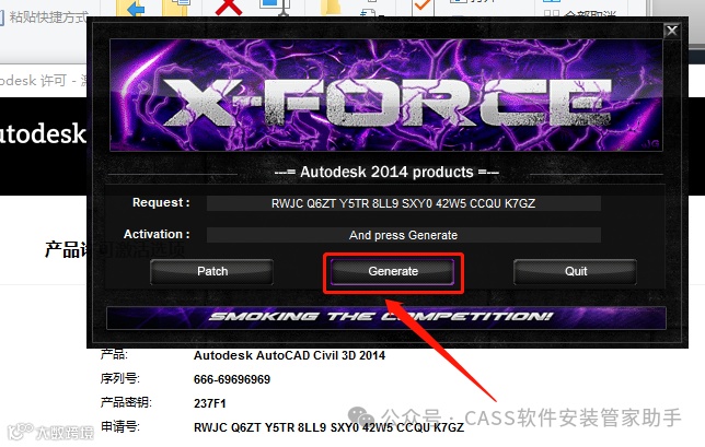 25.使用Ctrl+C键复制申请号,使用Ctrl+V键粘贴到注册机里面的【Request】中(记得删除原请求码中的内容),点击注册机左下角的【Patch】。