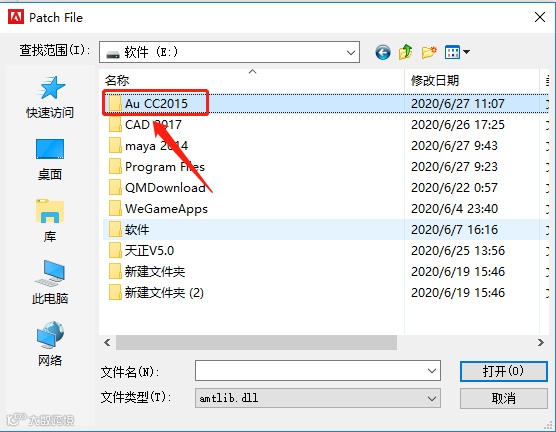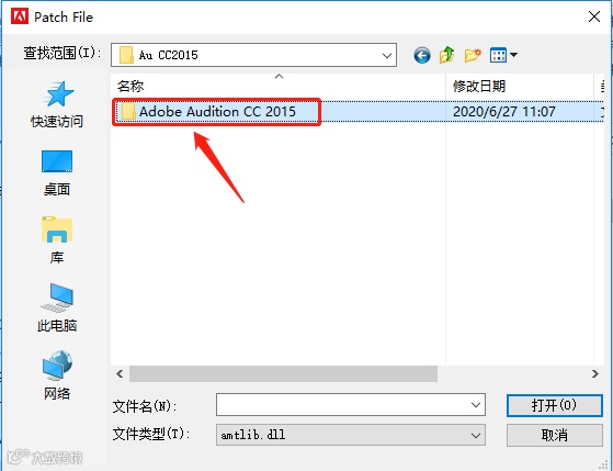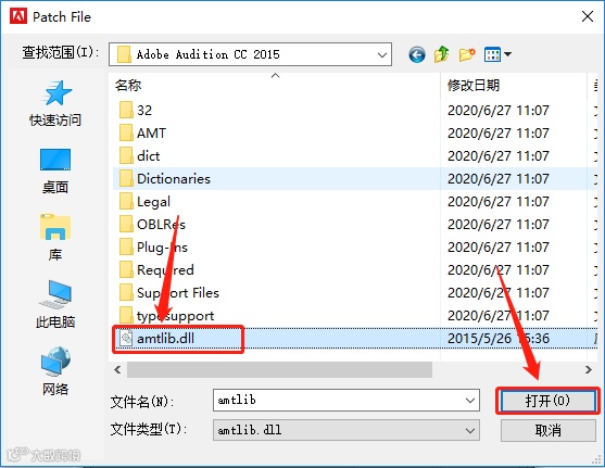 22.打开的【Adobe Audition CC 2015】文件夹中选中【amtlib.dll 】文件,点击【打开】。