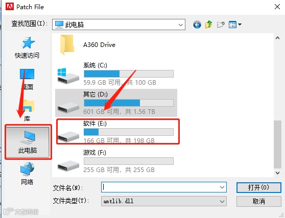19.需要找到软件安装路径里的【amtlib.dll】文件,打开【此电脑】,打开【E盘】。