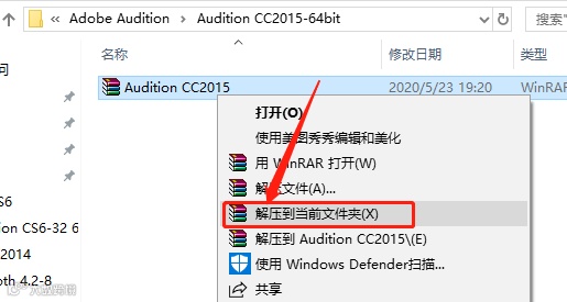 1.下载解压【Audition CC2015】安装包,鼠标右击【Audition CC2015】压缩包选择【解压到当前文件夹】。