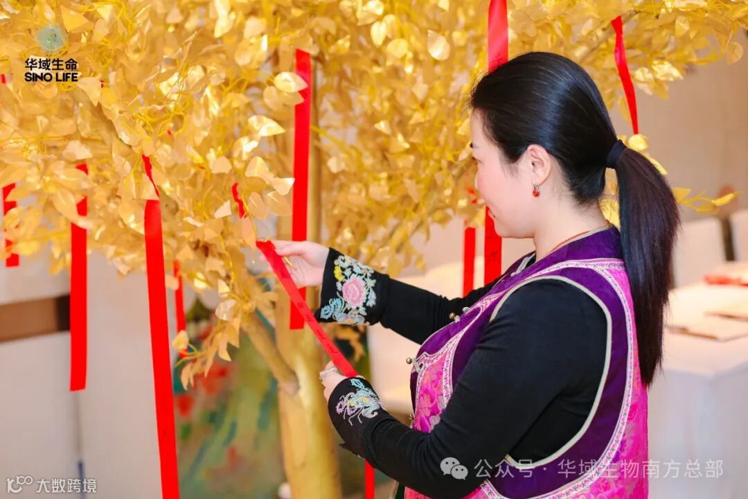 嘉宾亲书祈福红绸,挂于金树的繁枝茂叶之间,将阖家平安、财运亨通之愿,寄入华域之场、普陀之灵,以盼心想事成,所得皆所愿。