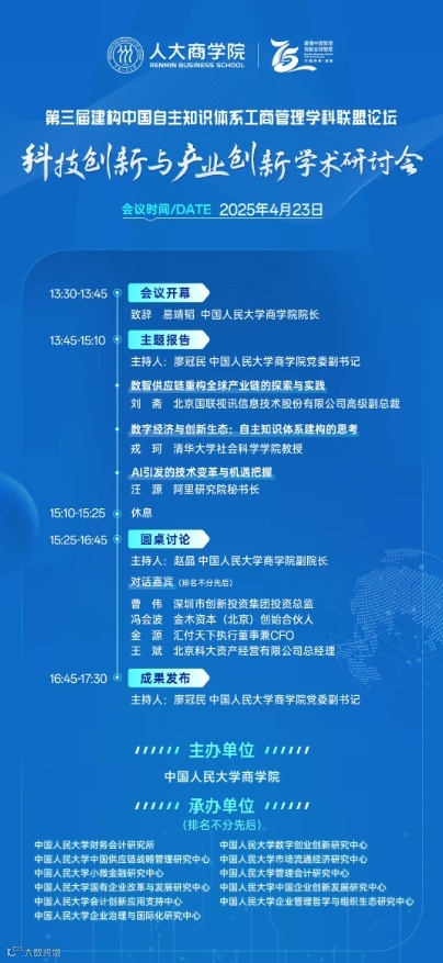 4月23日,由中国人民大学商学院主办的第三届建构中国自主知识体系工商管理学科联盟论坛“科技创新与产业创新”学术研讨会在中国人民大学中关村校区举行。作为产业互联网领域的领军企业,北京国联视讯信息技术股份有限公司(简称“国联股份”)受邀出席,与各界精英共探产业发展新路径。