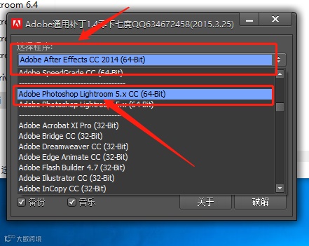 18、点击【选择程序】方框,下拉选择【 adobe photoshop Lightroom 5.X CC(64-bit) 】。