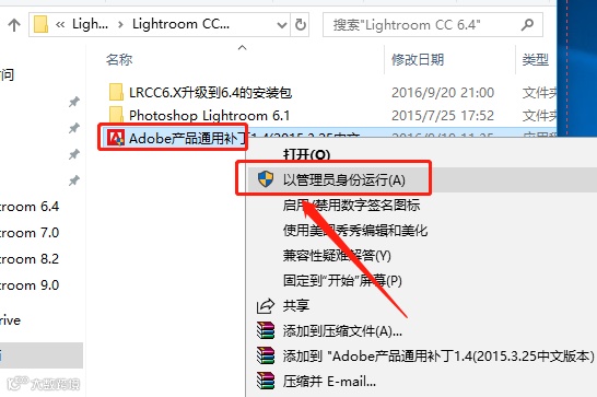 17、继续返回到解压的文件夹,鼠标右击【Adobe产品通用补丁】,选择【以管理员身份运行】。