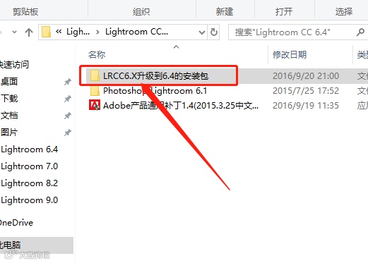 13、返回到之前解压的文件夹,打开【LRCC6.X升级到6.4安装包】文件夹。