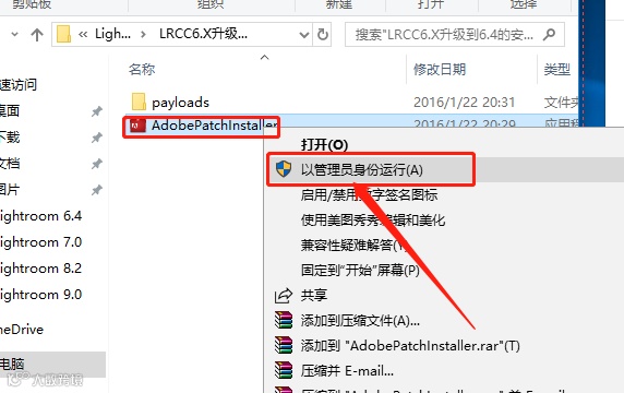 14、鼠标右击【AdobePatchInstaller】程序,选择【以管理员身份运行】。